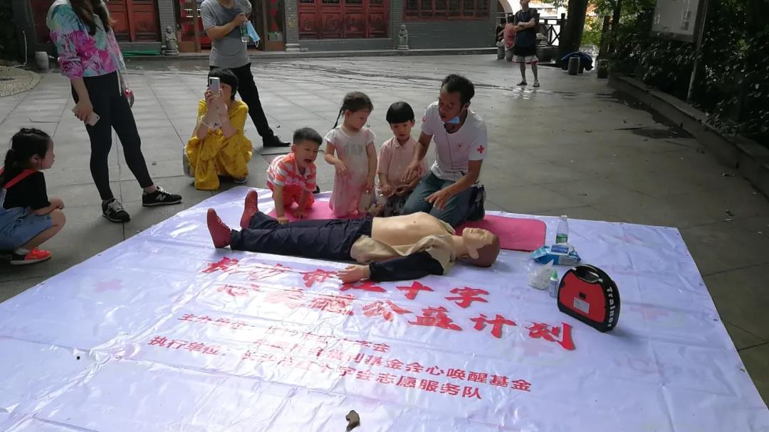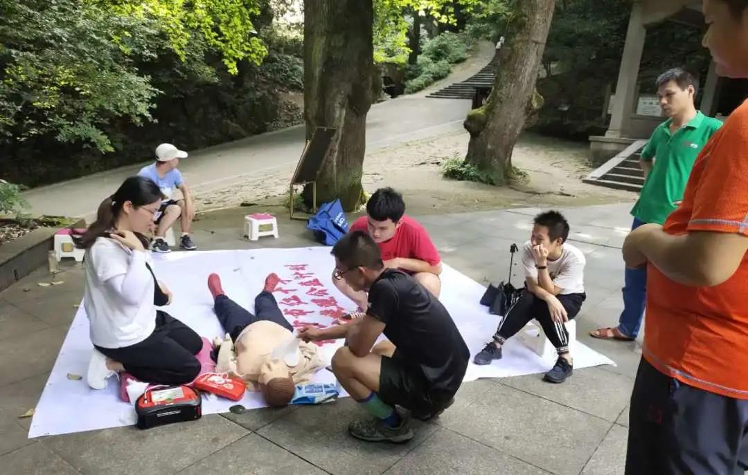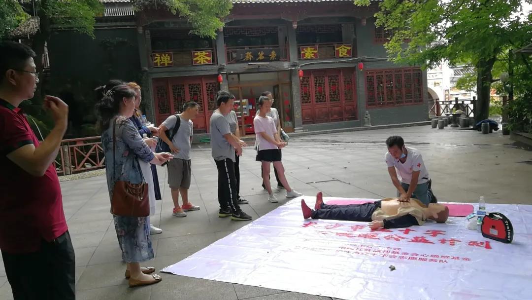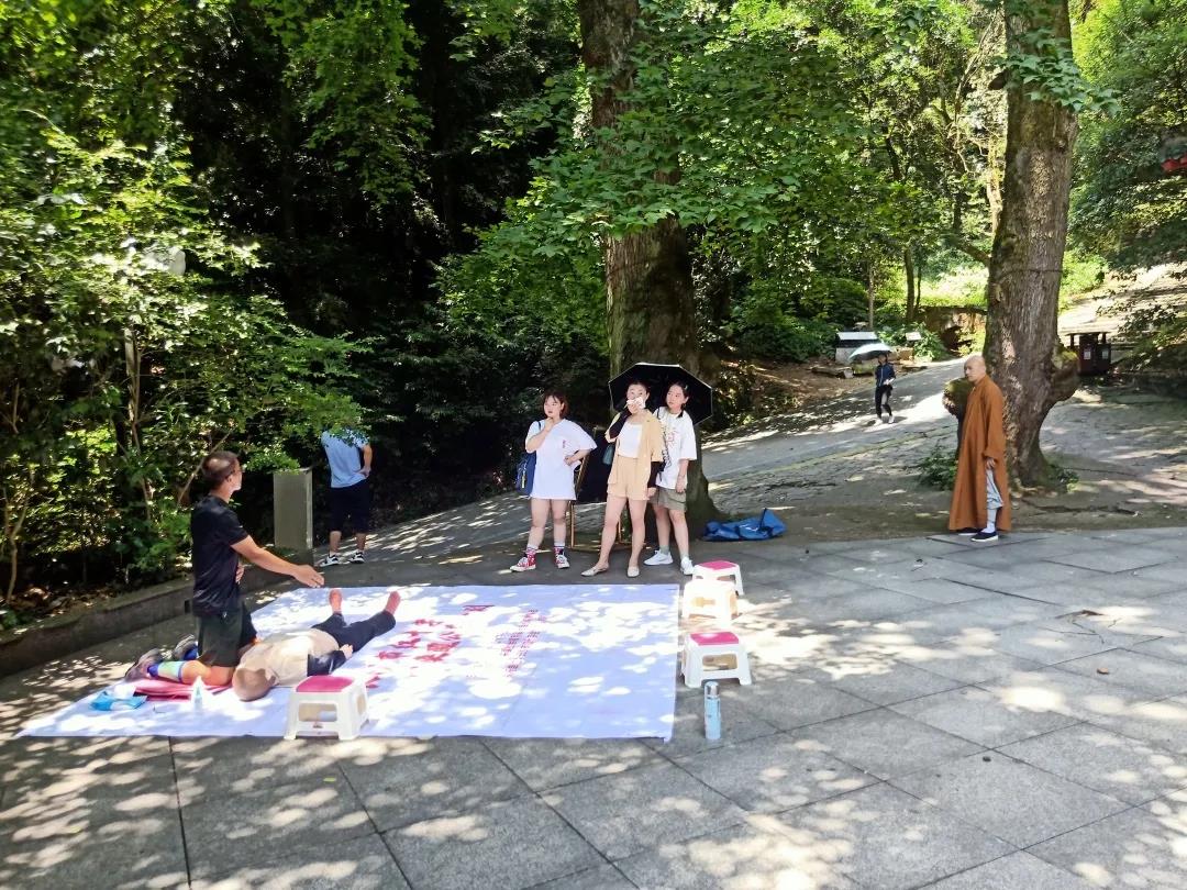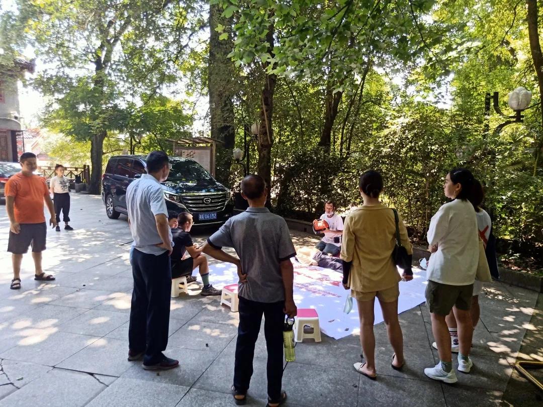 2020年6月13日上午10点,第2场“品素面,学急救”活动在麓山寺素茗斋门口、白鹤泉旁如期“摆摊”打卡,红十字救护师资、心唤醒讲师孙怀冬为本场“摊主”组长,其他“摊主”还有:急救侠刘思雅、急救侠夏天。由于周末,打卡“逛摊”人数比第1场要多不少,很多游客都亲自实操练习了,其中还有不少小孩子,甚至有的家长刚学完就协助孩子完成按压,咱们的各位急救侠“摊主”很有成就感。