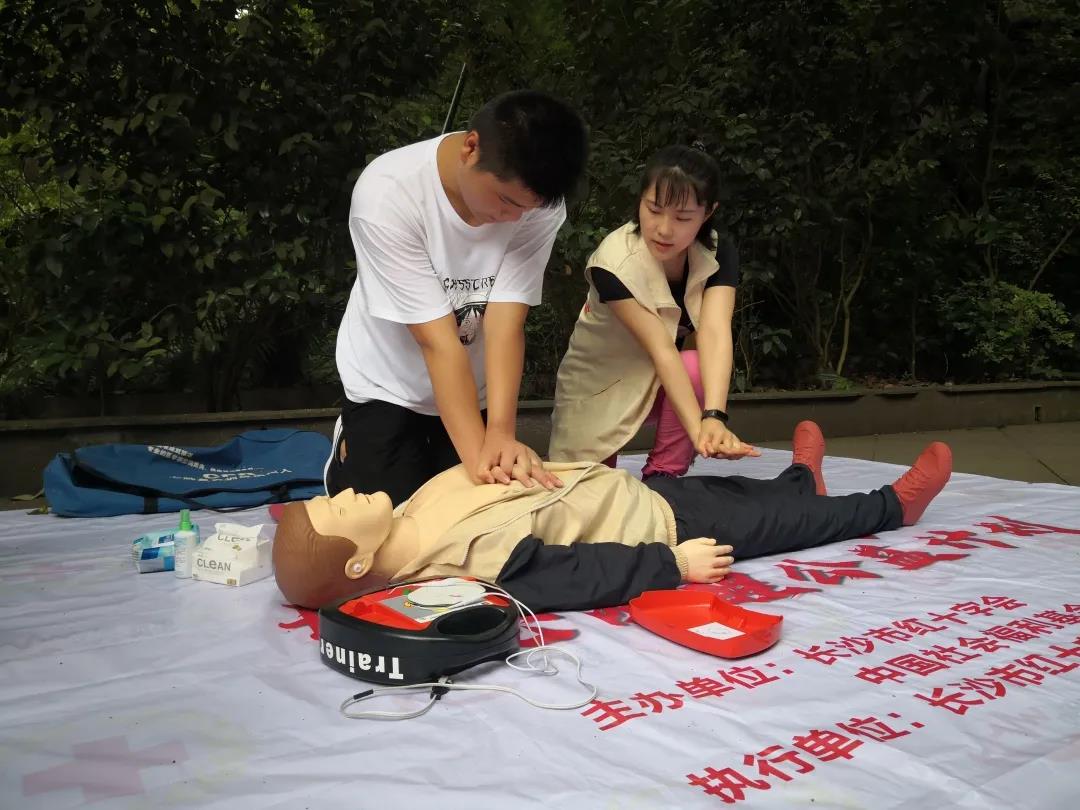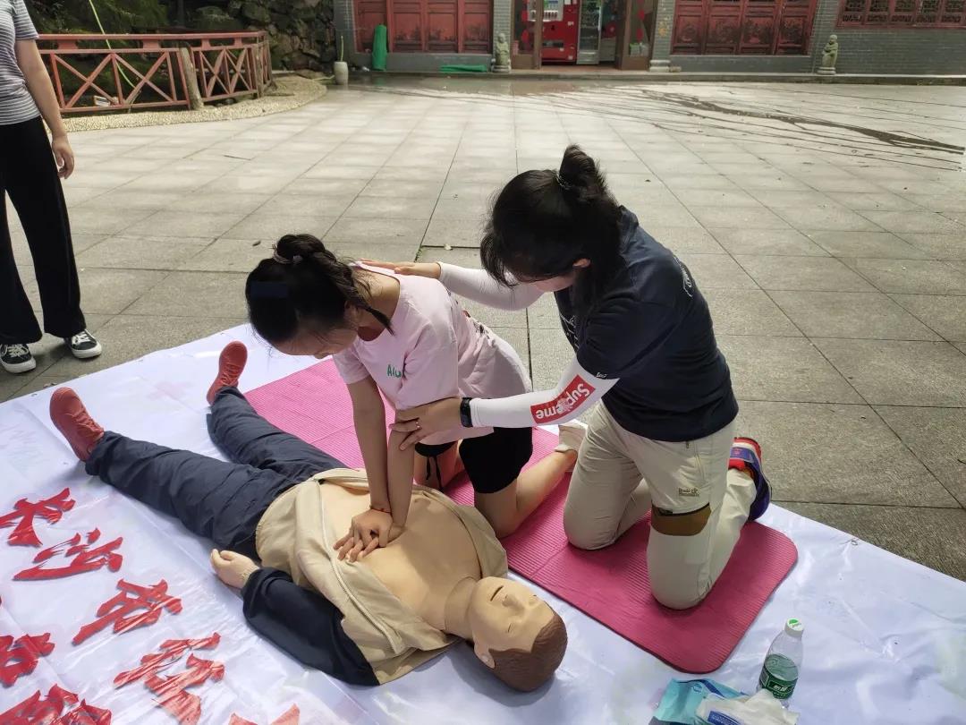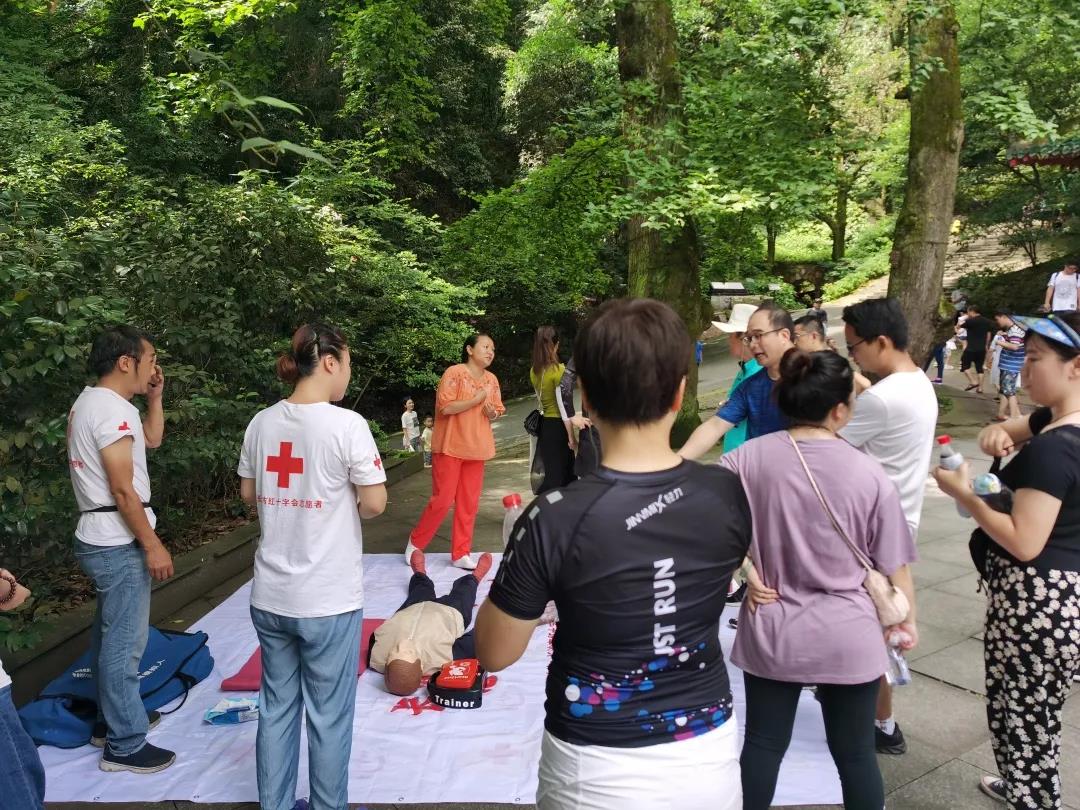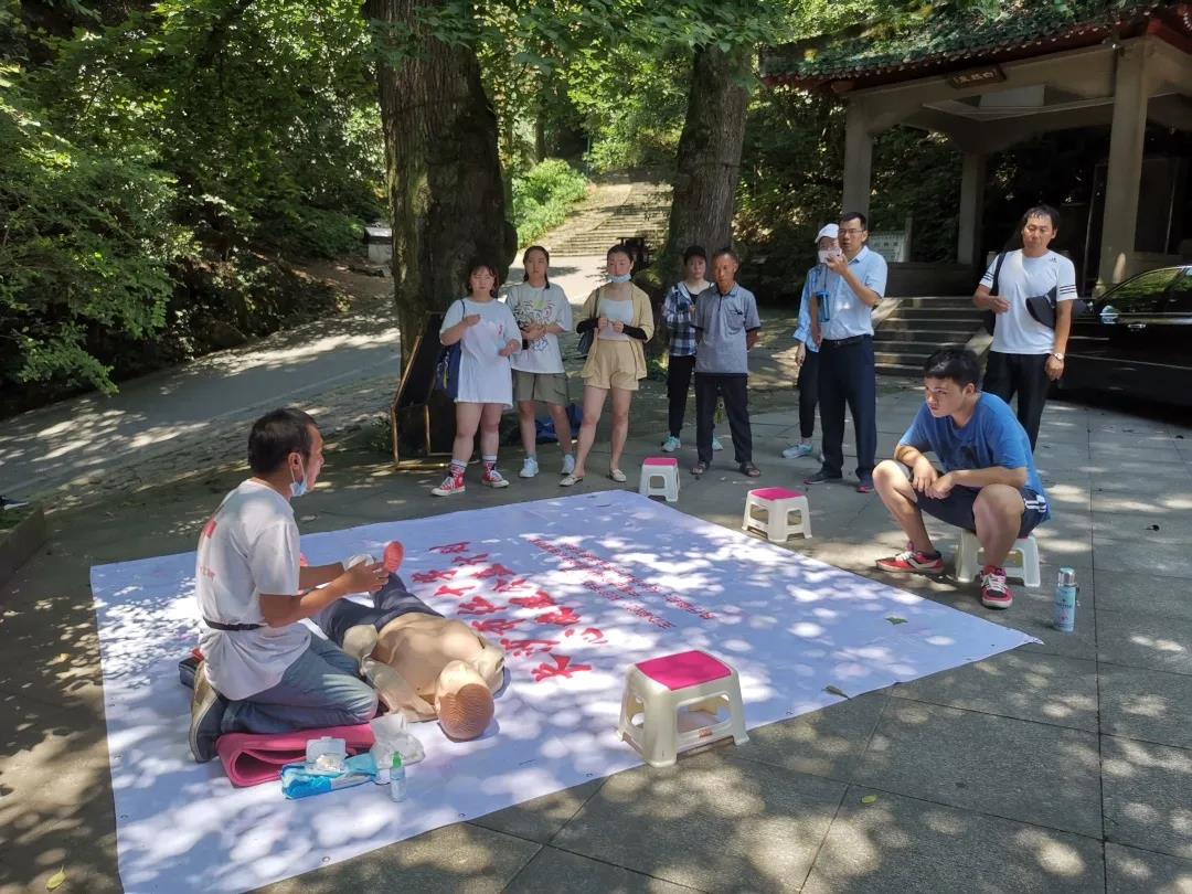 2020年6月13日上午10点,第2场“品素面,学急救”活动在麓山寺素茗斋门口、白鹤泉旁如期“摆摊”打卡,红十字救护师资、心唤醒讲师孙怀冬为本场“摊主”组长,其他“摊主”还有:急救侠刘思雅、急救侠夏天。由于周末,打卡“逛摊”人数比第1场要多不少,很多游客都亲自实操练习了,其中还有不少小孩子,甚至有的家长刚学完就协助孩子完成按压,咱们的各位急救侠“摊主”很有成就感。